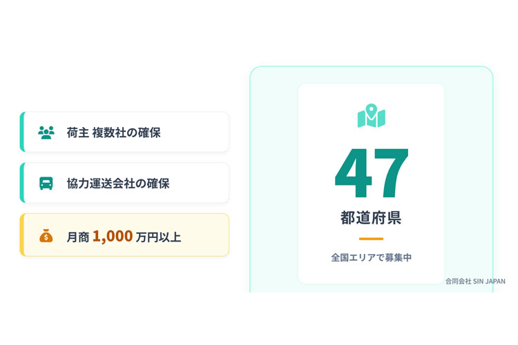 | 特長 | 加盟金・固定費ゼロ、在庫不要の成果報酬型モデル。荷主と運送会社をつなぐだけで、本部が実務を担当。自宅から副業でも始められ、リスクを抑えて継続収益を目指せます。 |