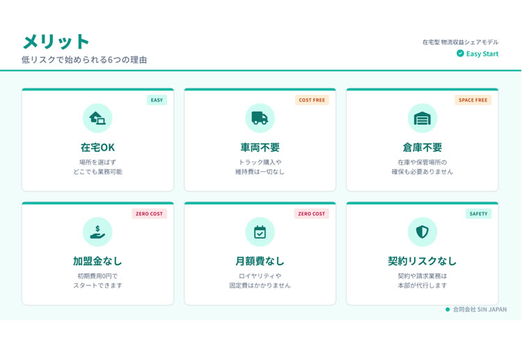 「物流収益シェアモデル」は、加盟金・登録費・月額費・ロイヤリティが一切不要の固定費ゼロで始められる新しいビジネスです。扱うのは在庫を伴う“モノ”ではなく“情報”であり、仕入れ資金や在庫リスクもありません。