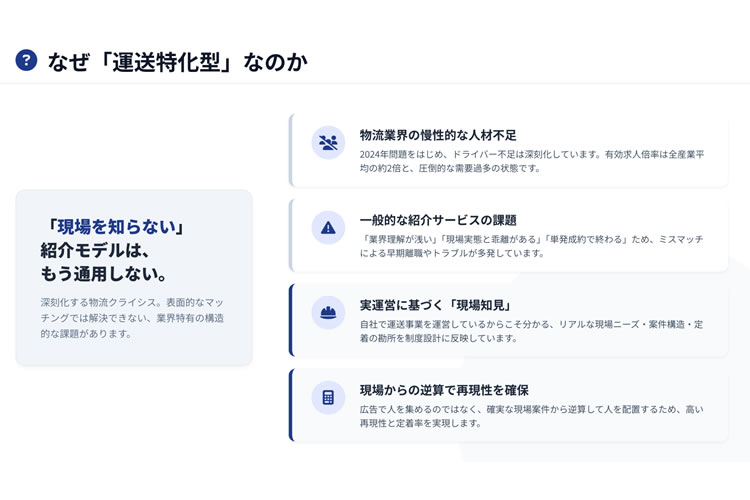 「運送特化型 人材紹介」は、物流業界に特化した人材紹介モデルを軸とし、実運送と連動する形で構築された業務委託型パートナー制度です。表面的なマッチングではなく、実際に稼働している物流現場でのニーズから逆算して設計されており、業界の構造的課題に対して実効性のあるアプローチが可能です。