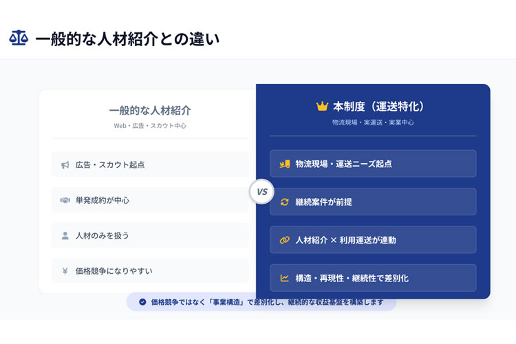 「運送特化型 人材紹介」は、物流業界に特化した人材紹介と運送案件の受注管理を組み合わせた業務委託型パートナー制度です。単なるマッチングではなく、物流現場の実際のニーズから逆算された仕組みにより、継続性・実効性のあるビジネスモデルを実現しています。