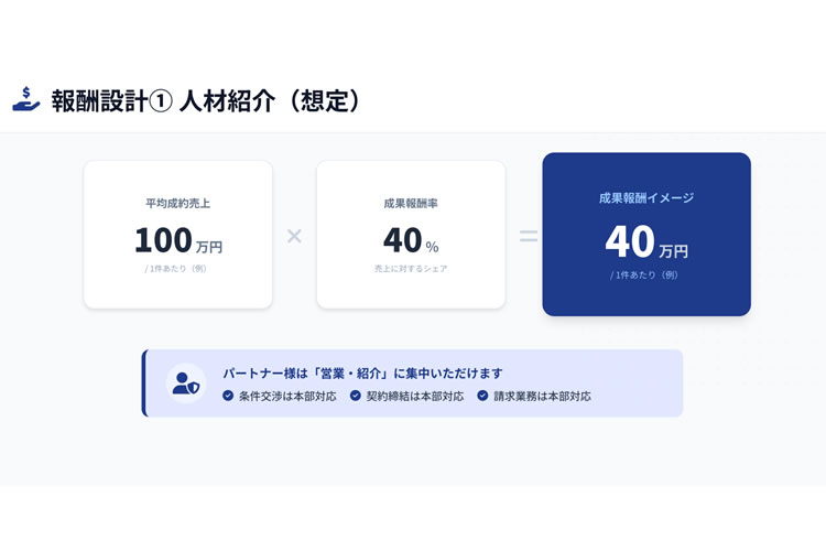 契約・請求・法務対応はすべて弊社が対応するため、パートナー様は営業・紹介活動に専念できます。また、弊社からは営業スクリプトや提案資料、案件管理システムなどを提供しますので、未経験でも早期の立ち上げ可能です。