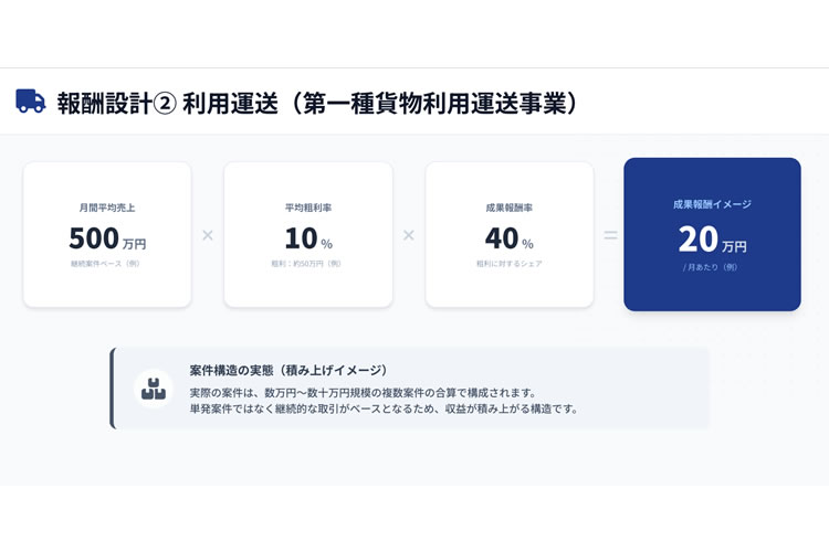 一般的な人材紹介とは異なり、案件は継続性を前提としており、単発報酬に依存せず、長期的な収益の積み上げが見込める構造となっています。さらに、紹介業務と同時に運送案件の受注・管理も組み込まれており、1件の紹介を起点に多面的な収益機会が期待できます。