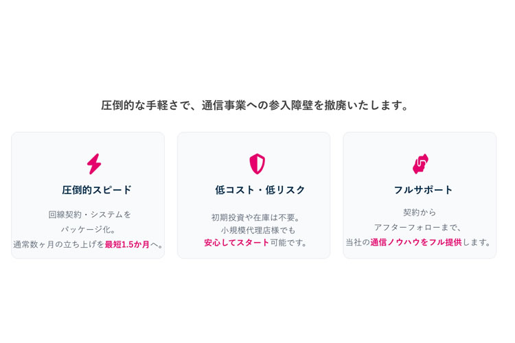通信の専門部署がなくても始められる体制が整っているため、「自社だけで対応できるか不安」という企業様でも安心して取り組めます。単なる商材提供ではなく、事業立ち上げの伴走パートナーとして支援いたします。