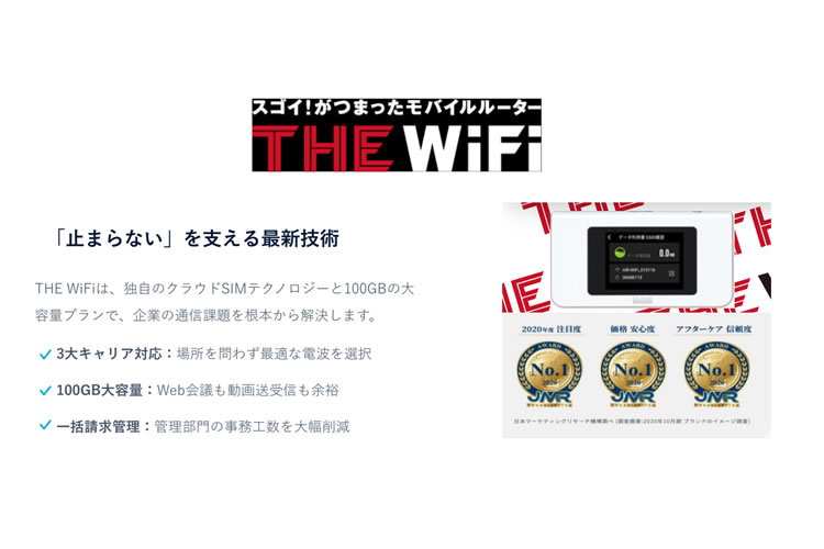 特長THE WiFiは、独自のクラウドSIMテクノロジーと100GBの大 容量プランで、企業の通信課題を根本から解決します。