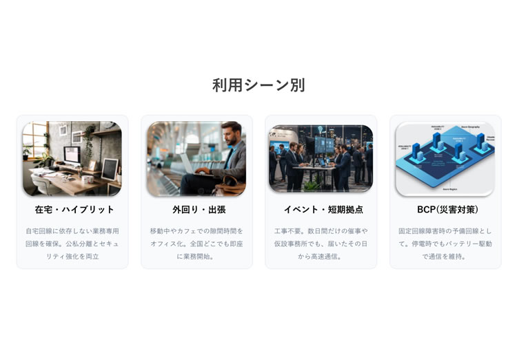 在宅勤務や営業、出張、災害時のバックアップ回線など幅広い用途に対応し、多くの法人に提案できる汎用性の高さも魅力。