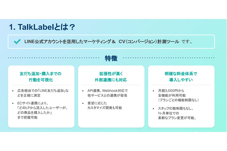 「TalkLabel」は、広告クリックからLINE友だち追加、そして最終的な購入・成約までの導線を一気通貫で可視化できるツールです。これまでブラックボックス化しやすかったLINE経由の成果を、データとして明確に把握できます。