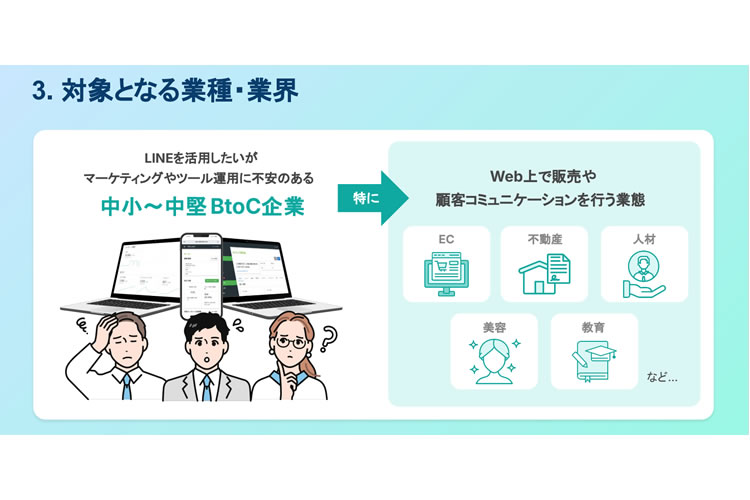| 特長 | 広告からLINE・購入までを可視化し売上改善を実現。成果報酬型かつ月額10%の継続報酬で、低リスクかつ安定収益を築ける代理店モデル。 |