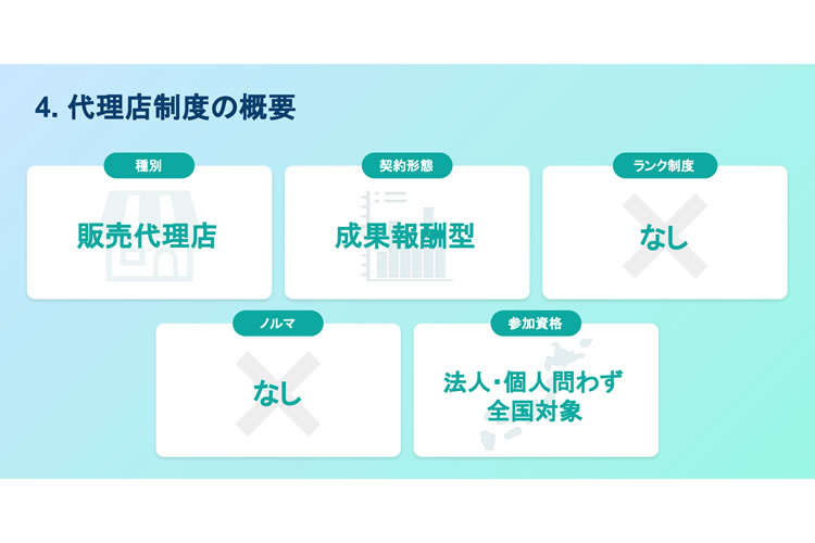 弊社の代理店制度はノルマなし。初期費用や在庫リスクもなく、成果報酬型で活動できるモデルです。副業や小規模事業者でも、無理なくスタートできる環境が整っています。