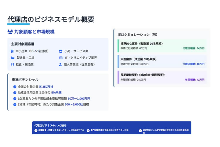 この代理店制度は、専門知識や営業経験がなくても始められる、シンプルかつ高収益なビジネスモデルです。