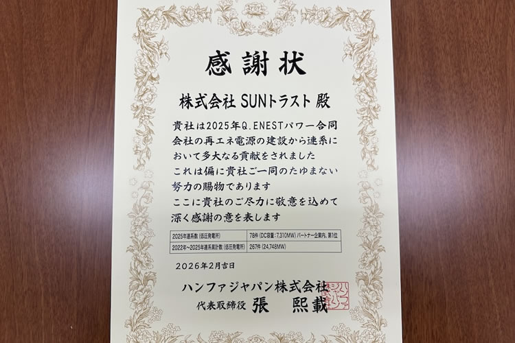 | 実績 | 当社は、2026年2月にハンファジャパン様より2025年度の再生可能エネルギーにおける電源建設から連系までの実績が評価され、2年連続で表彰を受けました。 |