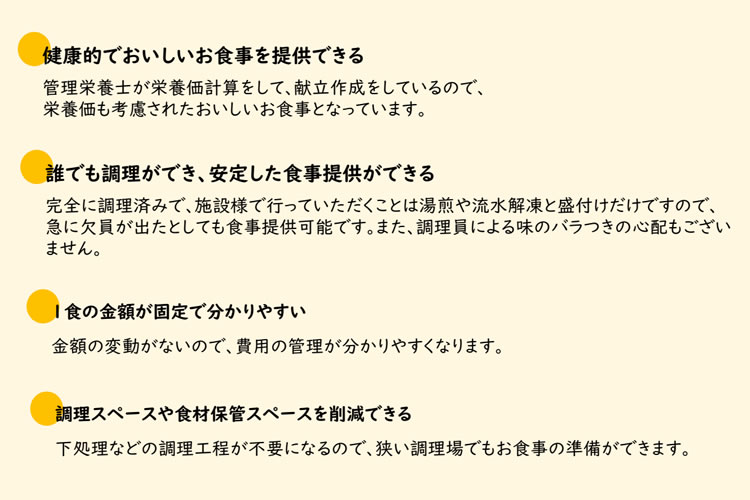 - 3 調理・食材保管スペースが最小限で済むため小規模施設にも最適!施設の規模にかかわらずご提案できます!