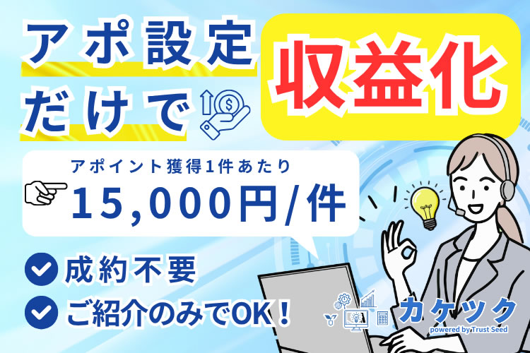 弊社のパートナー制度の大きな特長は、成約の有無に関わらず「アポイントが実施された時点」で報酬が発生する点です。商談結果に左右されることなく、安定した収益を見込むことが可能です。営業活動における心理的なハードルを下げ、「まずは紹介してみよう」と一歩踏み出しやすくしてくれます。特に新しい商材を扱う際には、「本当に売れるのか」という不安がつきものですが、カケツクではそのリスクを最小限に抑えることができます。