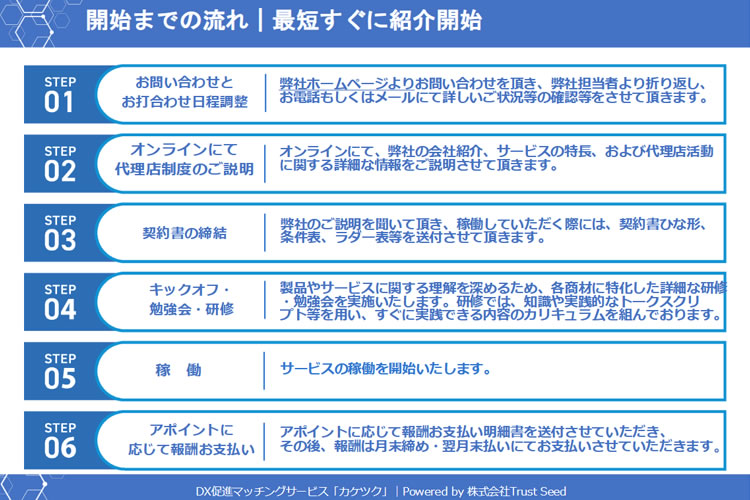 無理に売り込む必要がなく、あくまで「つなぐ」ことが価値になるビジネスモデル。だからこそ、これまで代理店にハードルを感じていた企業様でも、安心してスタートできる仕組みになっています。