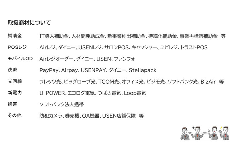 商材一覧 | IT導入補助金/人材開発助成金/新事業創出補助金/持続化補助金/事業再構築補助金/Airレジ/ダイニー/USENレジ/サロンPOS/キャッシャー/ユビレジ/トラストPOS/Airレジオーダー/ダイニー/USEN/ファンフォ/PayPay/Airpay/USENPAY/ダイニー/Stellapack/フレッツ光/ビッグローブ光/TCOM光/オフィス光/ビジモ光/ソフトバンク光/BizAir/U-POWER/エコログ電気/つばさ電気/Loop電気/ソフトバンク法人携帯/防犯カメラ/券売機/OA機器/USEN店舗保険 |