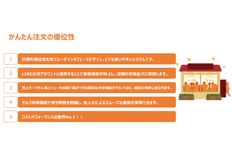 特長 | ・圧倒的優位性を持つユーザインタフェースデザイン。とても使いやすいシステムです。 ・LINE公式アカウントと連携することで集客機能が向上し、店舗の収益拡大に貢献します。 ・売上データや人気メニューを自動で集計できる豊富な分析機能がそろっており、経営の判断に役立ちます。 ・セルフ決済機能で待ち時間を短縮し、省人化によるスムーズな運営が実現できます。 ・コストパフォーマンスは業界No.1!! |