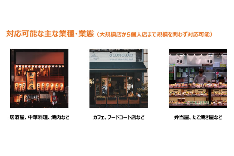 当サービスは、さまざまな業種・業態の店舗に柔軟に対応できる汎用性の高いシステムです。居酒屋・中華料理・焼肉店などの飲食店はもちろん、カフェやフードコート、弁当屋、テイクアウト専門店などでも導入実績があります。