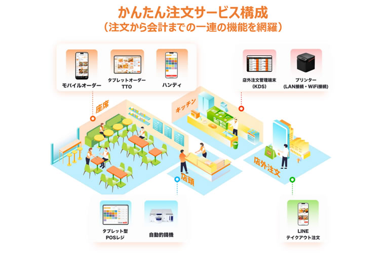 「かんたん注文」は、飲食店の注文・決済・会計管理をスマホで完結できるクラウド型システムです。POSレジや決済端末などを一元化し、現場の業務効率を大幅に改善。
