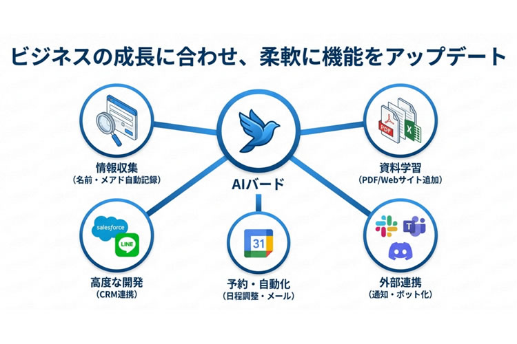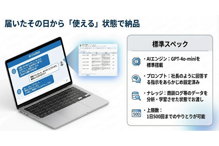 | 特長 | 在庫・開発不要で低リスク参入。本部が商談や提案を伴走支援し、段階的な研修と動画プログラムで未経験でも安心してAI市場に挑戦できるパートナーモデル。 |