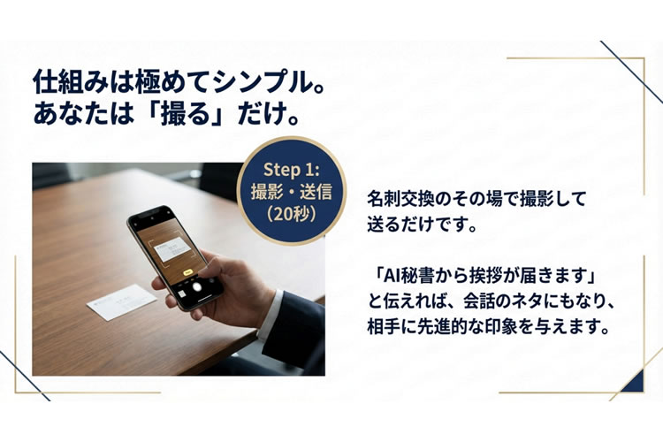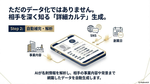 | 特長 | 名刺撮影20秒で登録完了。AIが詳細カルテを生成し、翌日から10年先まで自然な文章で継続フォローを自動設計します。 |
