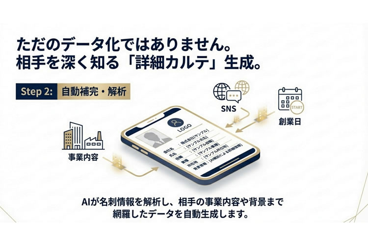 営業は、タイミングと情報の質が成果を左右します。当サービスは、登録の手軽さと高度な情報解析を両立し、出会いを“管理する情報”から“活かせる情報”へと進化させます。一瞬の名刺交換を、戦略的な営業活動の起点へと変える仕組みです。