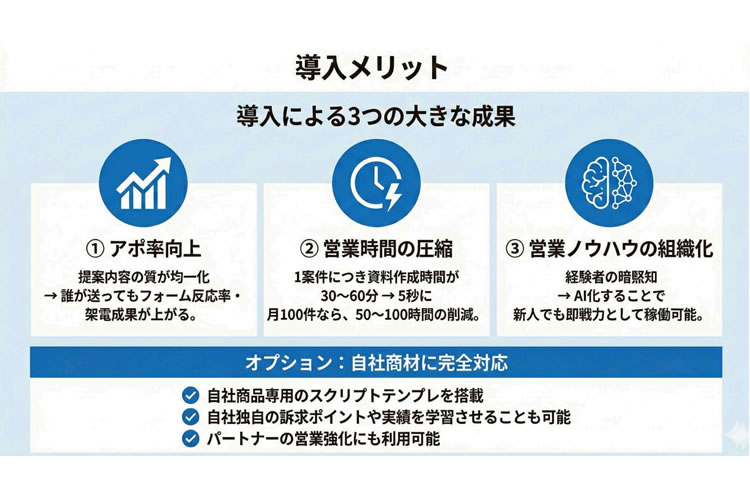 これにより、属人的な営業スキルに頼らず、誰でも一定以上のパーソナライズ提案が実現可能となります。営業の質を保ちながら、アポ率・成約率の向上を目指せる強力な支援ツールです。