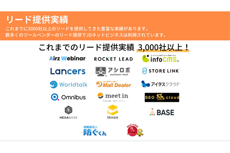 | サービスの特長 | ■完全成果報酬でリード獲得を代⾏ JDネットのパートナー企業ネットワークを活⽤し、全国の41,000社に御社サービスをシェアしています。 ■リード提供実績 これまでに3000社以上のリードを提供してきた豊富な実績があります。 数多くのツールベンダーのリード提供でJDネットビジネスは利⽤されています。 |
