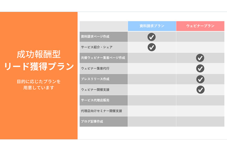 | 特長 | 約1,000社の提携企業と4万社超の中小企業リストを活用し、信頼性の高いBtoB情報発信と成果報酬型リード獲得を実現します。 |