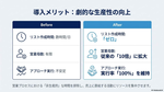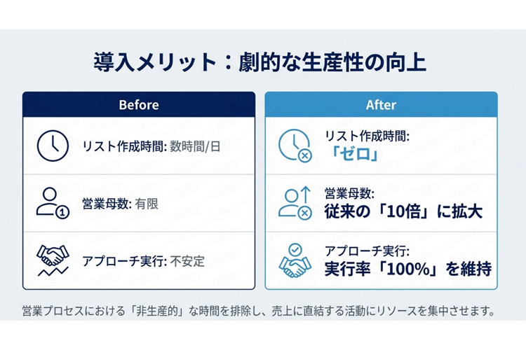 人では到底追いつかない量とスピードで、営業の“母数”を増やすことができるため、商談機会の創出に直結します。営業を「作業」から解放し、本来の価値発揮である提案活動へとシフトさせることだできます。