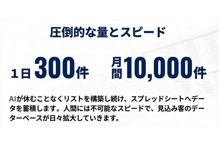 当サービスでは、条件を指定するだけで、AIが自動で営業リストを構築します。1日最大300件、月間1万件規模のリスト生成が可能という圧倒的なスピードで、見込み顧客データベースを拡張していきます。